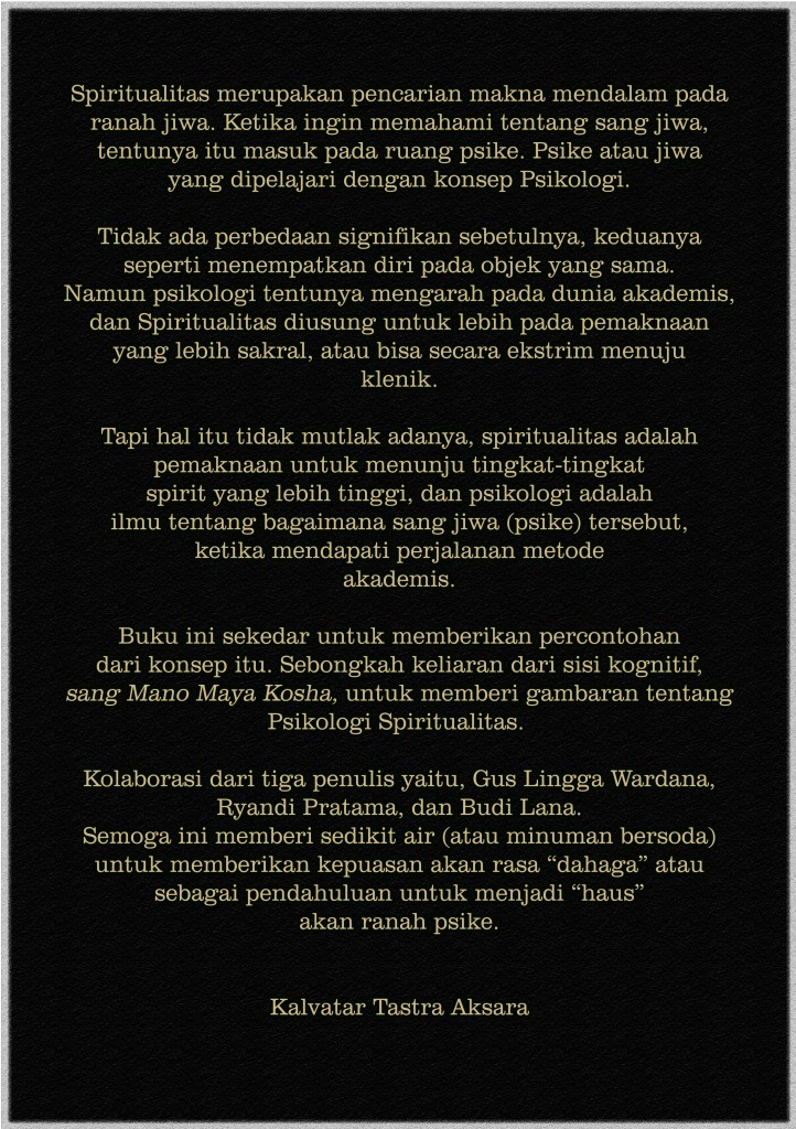 Tiga penulis ini yang bertemu secara kebetulan oleh semesta sebagai sang dalang, bisa membawa sedikit pesat-pesan tertentu dalam membahas, membagi, menguak suatu pemaknaan jiwa pada perspektif spiritualitas. Gus Lingga, Ryandi, dan Budi Lana adalah bagian dari petualang, pendaki, penelisik semesta yang sepertinya senang “terbang, berenang, bersorai” pada semesta di dalam diri. Ini Sebuah etnografi tentang perjalanan itu di dalam diri, atau suatu catatan interpretasi hermeneutik simbolik tentang “sang sangkan paran”. Dan akhir kata, semoga ruang kenan ada dalam sang manah (pikiran), ruang dahaga buddhi (rasa) tersegarkan, cahaya intuisi (citta) terungkapkan. Sekedar memberi asupan ahamkara diri, dengan tetap berpegang pada sang diri sebagai abdi semesta yang dharmika.