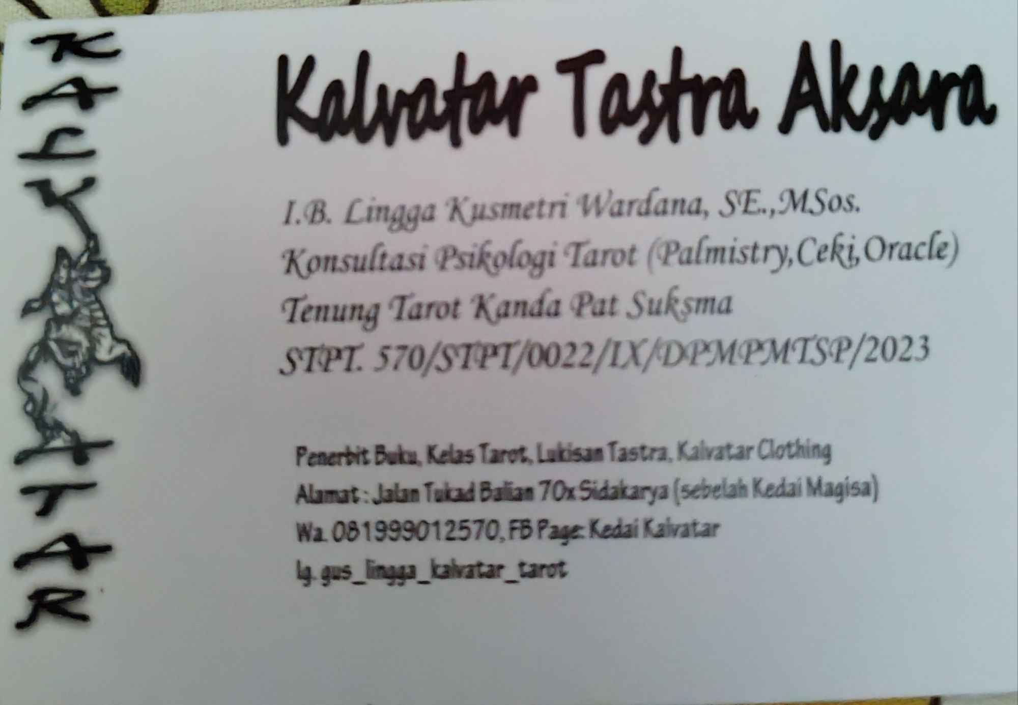 Serta membuka Konsultasi Psikologi Tarot Reading Kanda Pat Suksma Kalvatar Bali. Dengan Nomor Ijin Praktek,