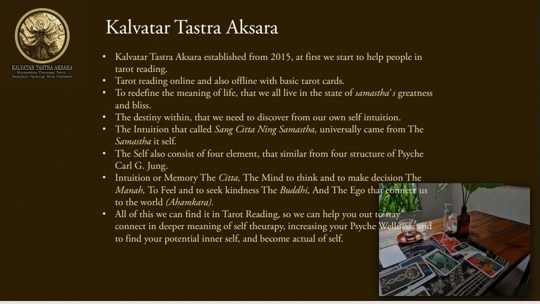 Tarot adalah pembahasan, pemaknaan, tentang kehidupan, yang di dalamnya berisikan bahasa alam bawah sadar. Sebagaimana disebutkan bahasa simbol yang merupakan arketipe yg telah ada dari masa lampau..